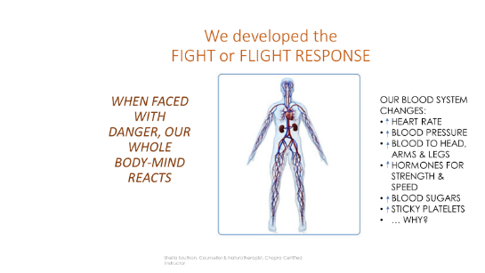 Physical survival required some amazing adaptations in our bodies. At the instant we think we’re threatened, every system, every organ, every cell in our body reacts instantaneously and synchronistically with no intellectual interference on our part. Our Autonomic Nervous System (ANS) sends messages in the form of chemicals and neural impulses throughout our body to get ready to fight, run or freeze to survive.
